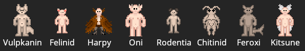 Vulpkanin, Felinid, Harpy, Oni, Rodentia, Chitinid, Feroxi, and Kitsune are Delta-V specific species.